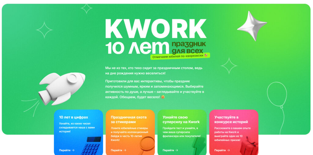 - Kwork: десять лет, которые изменили фрилансБирже Kwork исполнилось 10 лет! Это не просто повод для торта — это итог десятилетнего эксперимента по созданию рынка, где… Читать далее: Kwork: десять лет, которые изменили фриланс